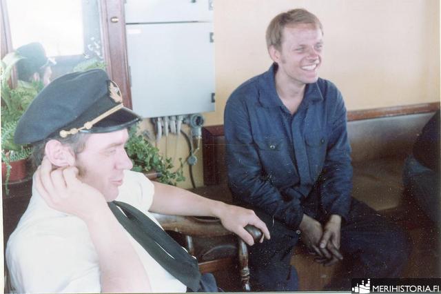 Kapten Claes Insulander och maskinchefen ? på MARIEFREDS brygga under resa från Stockholm kl 10.