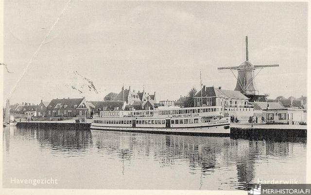Tryckt text på bildsidan: Havengezicht Harderwijk Text på fartygets överbyggnad: HOLLAND-VELUWE-LIJN Se även VELUWE och F.P. von KNORRING för jämförelse med holländska insjöbåtar!