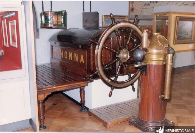 OIHONNAS roderkista med ratt och nakterhus utställda i sjöfartsmuseet.