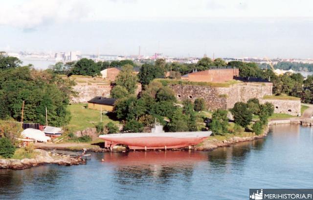 Museiubåten VESIKKO på Sveaborg, sedd från förbipasserande fartyg i utrikesfart.